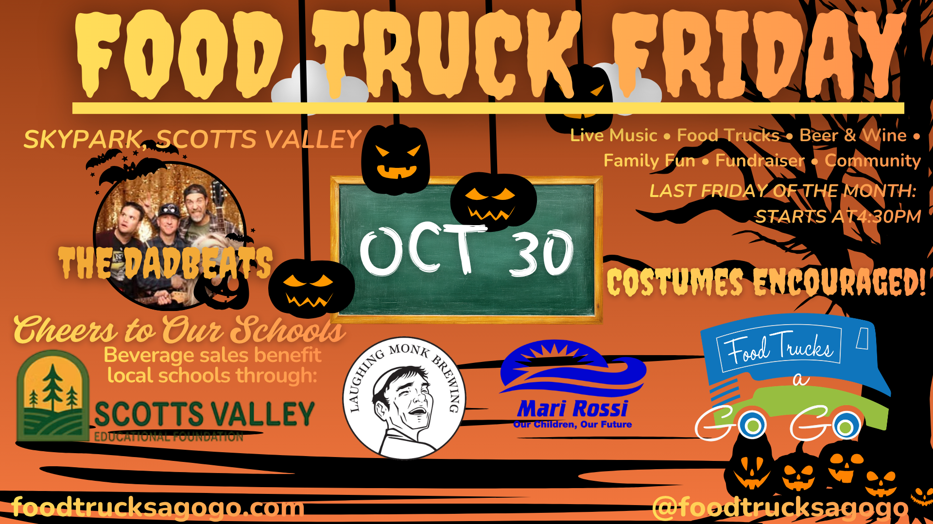 OCTOBER FOOD TRUCK FRIDAY (EARLY START)! 🎃 Please note special 4:30 PM start time! Join us for our grand season finale at Skypark on October 30. We are wrapping up with a huge community bash featuring Dadbeats, bringing a nostalgic mix of danceable covers. Skip the kitchen and enjoy the region’s best trucks, including Pana and Tacos el Jesse. Come out for face painting, live music, and one last opportunity to raise a glass for our students at the SVEF Beer & Wine Garden. Don't miss this epic season closer! Live Music Sponsored by Mari Rossi—Our Children, Our Future.
