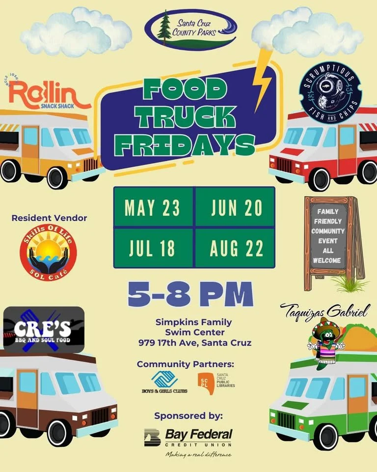 Fridays May 23rd, June 20th, July 18th, and August 22nd, stop by from 5 to 8 pm at Simpkins Family Swim Center in Live Oak for delicious food trucks, fun spots to hang out, and much more!